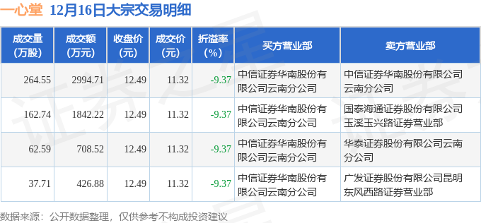 证券之星消息,12月16日一心堂发生大宗交易,交易数据如下: