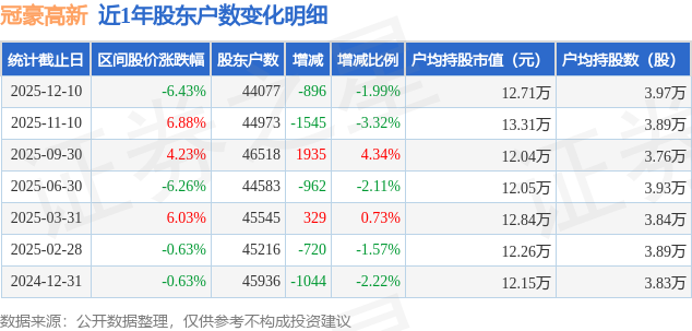 证券之星消息,近日冠豪高新披露,截至2025年12月10日公司股东户数为4.41万户,较11月10日减少896.0户,减幅为1.99%。户均持股数量由上期的3.89万股增加至3.97万股,户均持股市值为12.71万元。