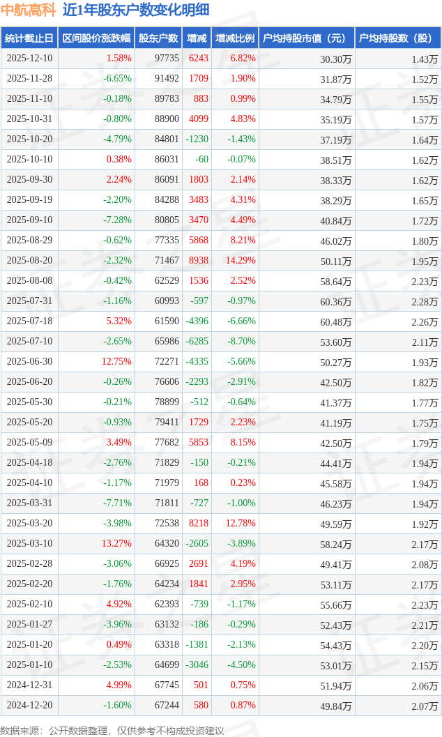 从股价来看,2025年11月28日至2025年12月10日,中航高科区间涨幅为1.58%,在此期间股东户数增加6243.0户,增幅为6.82%。