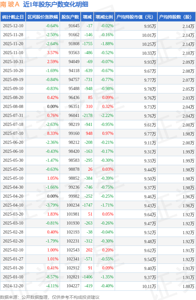从股价来看,2025年11月28日至2025年12月10日,南 玻A区间跌幅为0.64%,在此期间股东户数减少17.0户,减幅为0.02%。