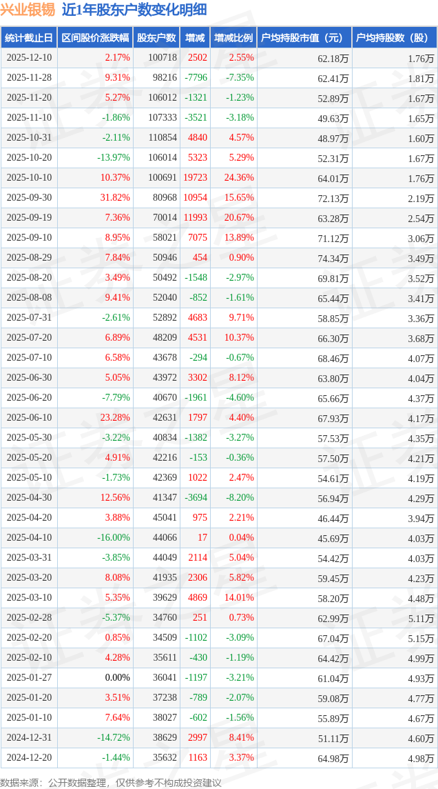 从股价来看,2025年11月28日至2025年12月10日,兴业银锡区间涨幅为2.17%,在此期间股东户数增加2502.0户,增幅为2.55%。