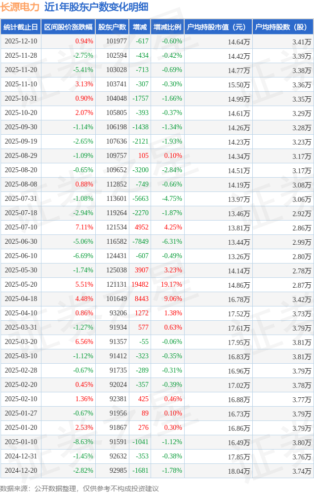 从股价来看,2025年11月28日至2025年12月10日,长源电力区间涨幅为0.94%,在此期间股东户数减少617.0户,减幅为0.6%。