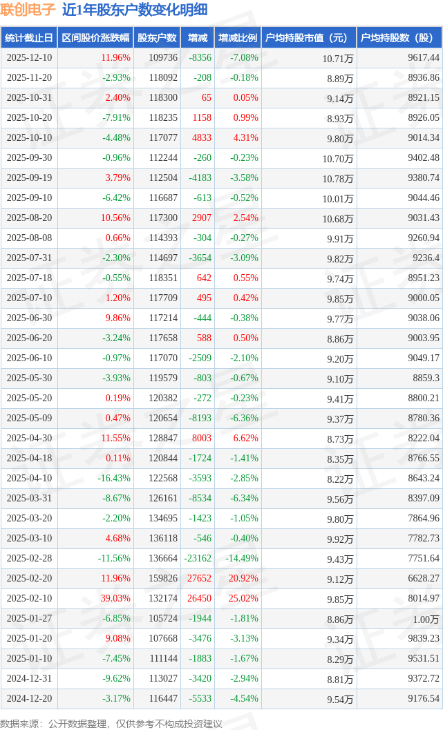 从股价来看,2025年11月20日至2025年12月10日,联创电子区间涨幅为11.96%,在此期间股东户数减少8356.0户,减幅为7.08%。