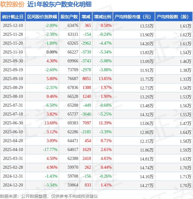 从股价来看,2025年11月28日至2025年12月10日,软控股份区间跌幅为2.09%,在此期间股东户数增加365.0户,增幅为0.58%。