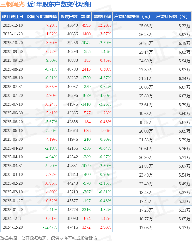 从股价来看,2025年11月20日至2025年12月10日,三钢闽光区间涨幅为7.29%,在此期间股东户数增加4993.0户,增幅为12.28%。