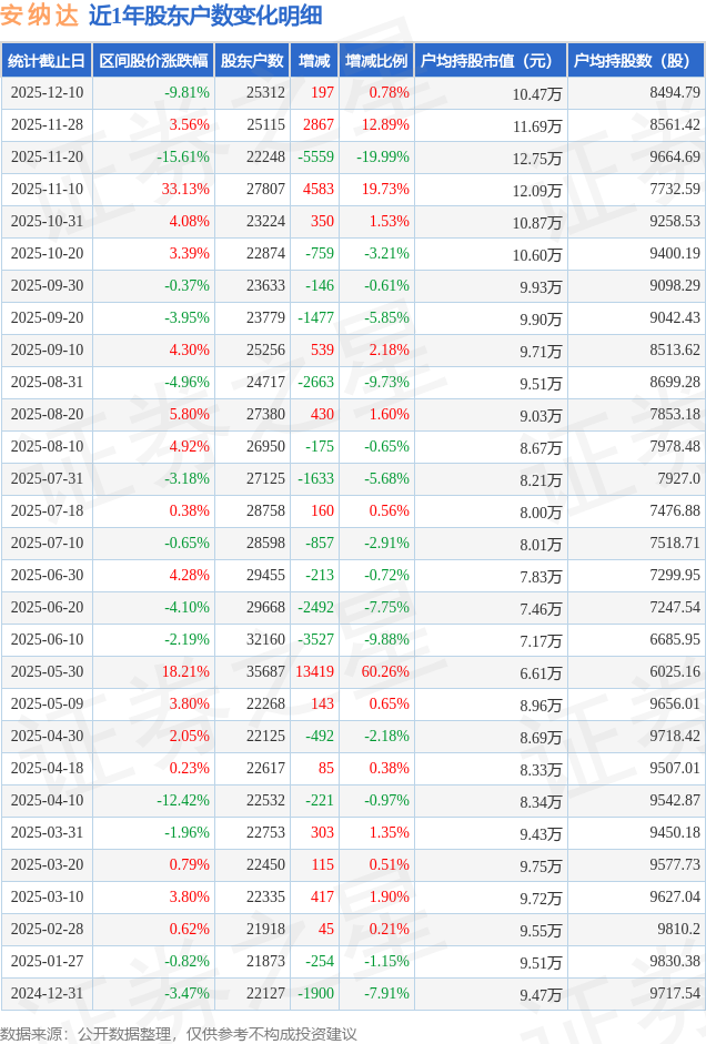 从股价来看,2025年11月28日至2025年12月10日,安 纳 达区间跌幅为9.81%,在此期间股东户数增加197.0户,增幅为0.78%。