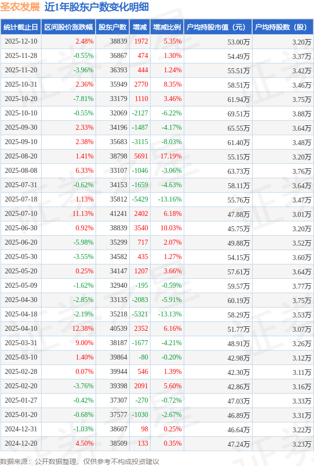 从股价来看,2025年11月28日至2025年12月10日,圣农发展区间涨幅为2.48%,在此期间股东户数增加1972.0户,增幅为5.35%。