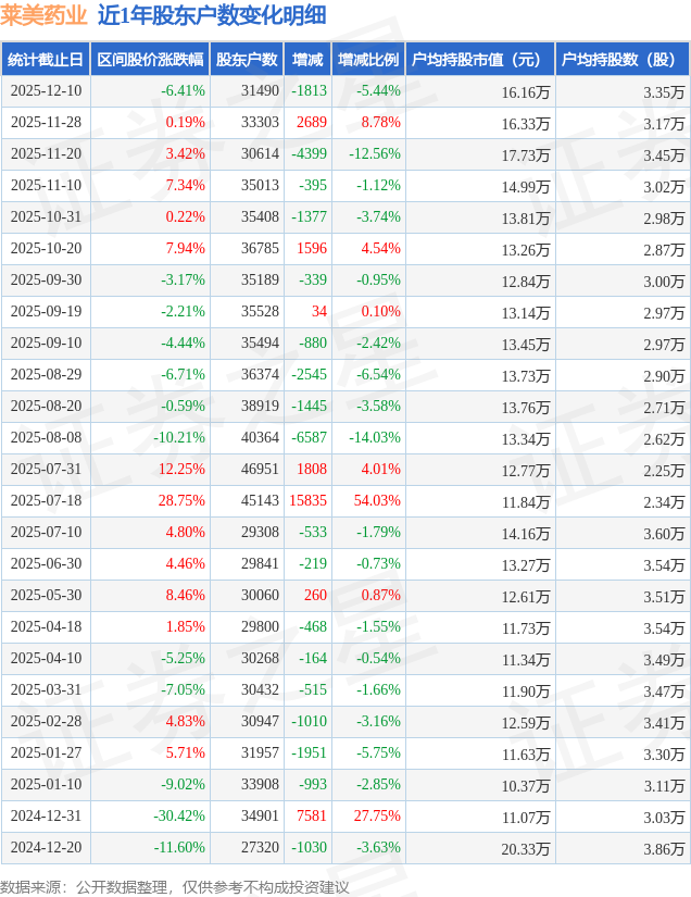 从股价来看,2025年11月28日至2025年12月10日,莱美药业区间跌幅为6.41%,在此期间股东户数减少1813.0户,减幅为5.44%。