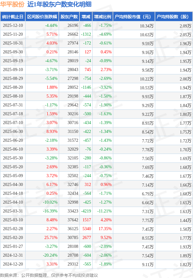 从股价来看,2025年11月20日至2025年12月10日,华平股份区间跌幅为4.44%,在此期间股东户数减少466.0户,减幅为1.75%。