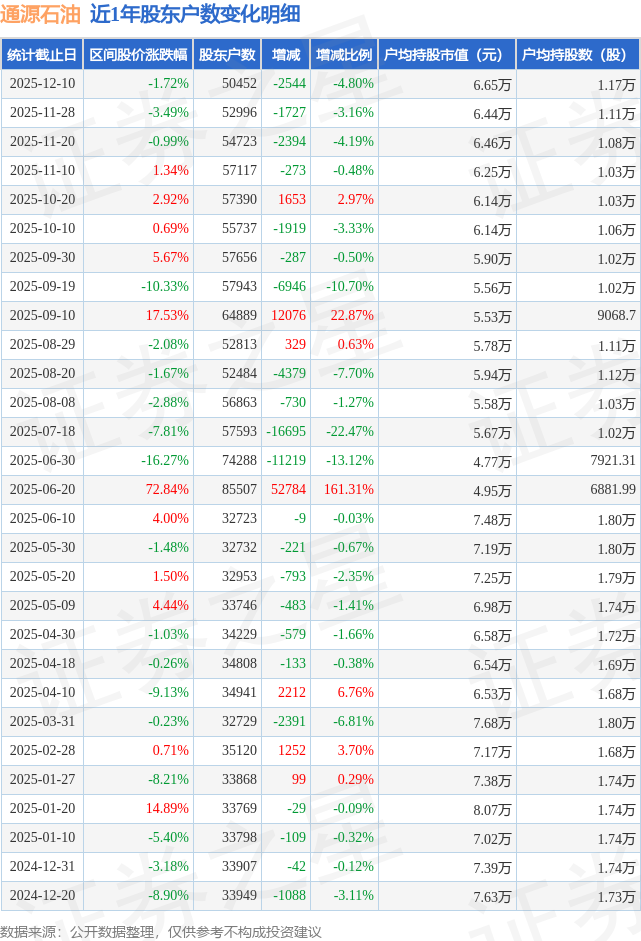 从股价来看,2025年11月28日至2025年12月10日,通源石油区间跌幅为1.72%,在此期间股东户数减少2544.0户,减幅为4.8%。