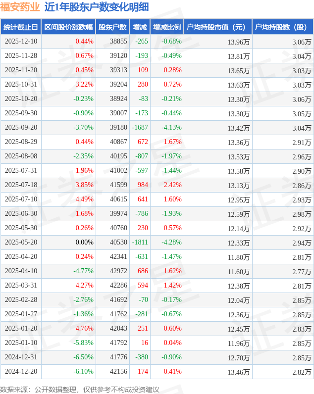 从股价来看,2025年11月28日至2025年12月10日,福安药业区间涨幅为0.44%,在此期间股东户数减少265.0户,减幅为0.68%。