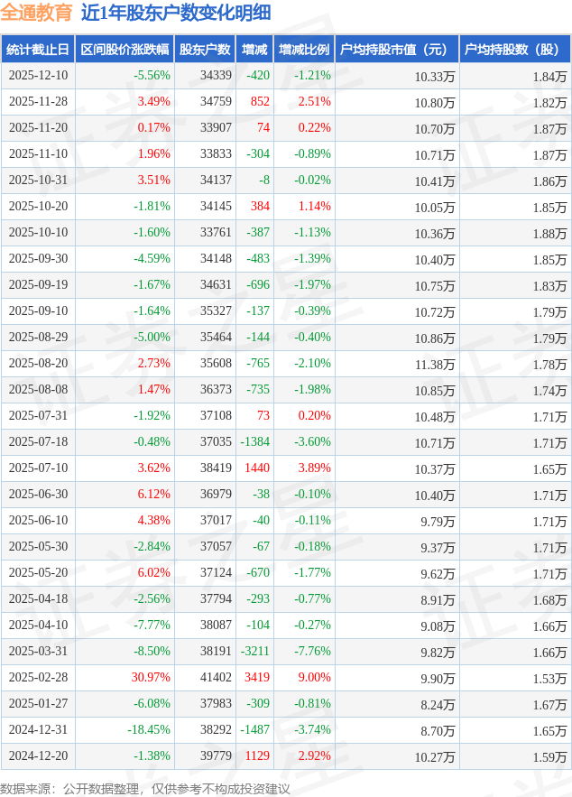 从股价来看,2025年11月28日至2025年12月10日,全通教育区间跌幅为5.56%,在此期间股东户数减少420.0户,减幅为1.21%。
