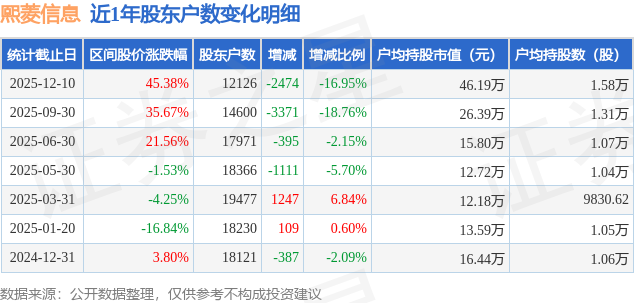 从股价来看,2025年9月30日至2025年12月10日,熙菱信息区间涨幅为45.38%,在此期间股东户数减少2474.0户,减幅为16.95%。