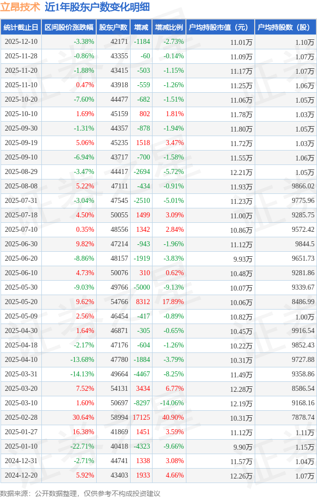 从股价来看,2025年11月28日至2025年12月10日,立昂技术区间跌幅为3.38%,在此期间股东户数减少1184.0户,减幅为2.73%。