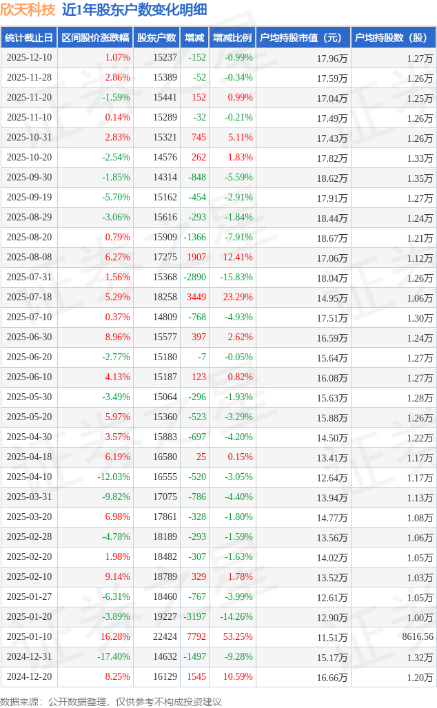 从股价来看,2025年11月28日至2025年12月10日,欣天科技区间涨幅为1.07%,在此期间股东户数减少152.0户,减幅为0.99%。
