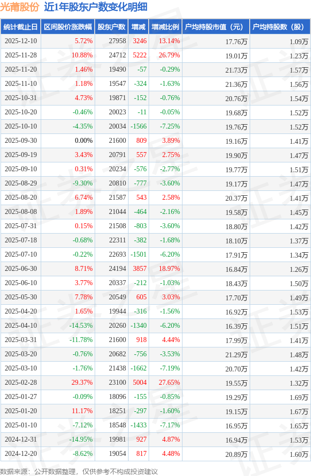从股价来看,2025年11月28日至2025年12月10日,光莆股份区间涨幅为5.72%,在此期间股东户数增加3246.0户,增幅为13.14%。