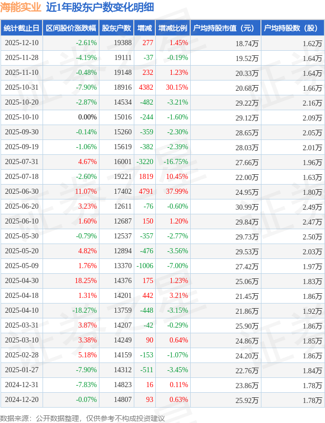 从股价来看,2025年11月28日至2025年12月10日,海能实业区间跌幅为2.61%,在此期间股东户数增加277.0户,增幅为1.45%。