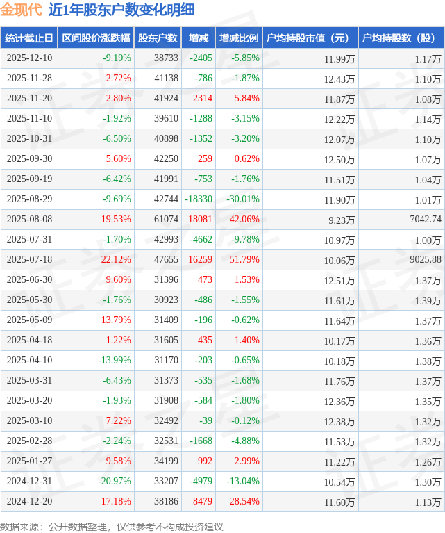 从股价来看,2025年11月28日至2025年12月10日,金现代区间跌幅为9.19%,在此期间股东户数减少2405.0户,减幅为5.85%。