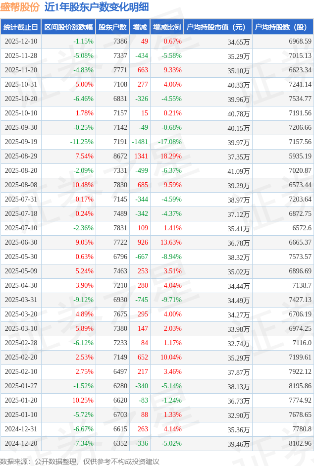 从股价来看,2025年11月28日至2025年12月10日,盛帮股份区间跌幅为1.15%,在此期间股东户数增加49.0户,增幅为0.67%。