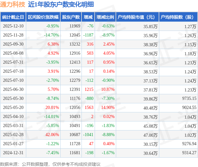 从股价来看,2025年11月28日至2025年12月10日,通力科技区间跌幅为0.95%,在此期间股东户数减少76.0户,减幅为0.63%。