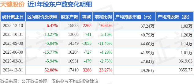 从股价来看,2025年10月31日至2025年12月10日,天键股份区间涨幅为6.47%,在此期间股东户数增加2265.0户,增幅为16.64%。