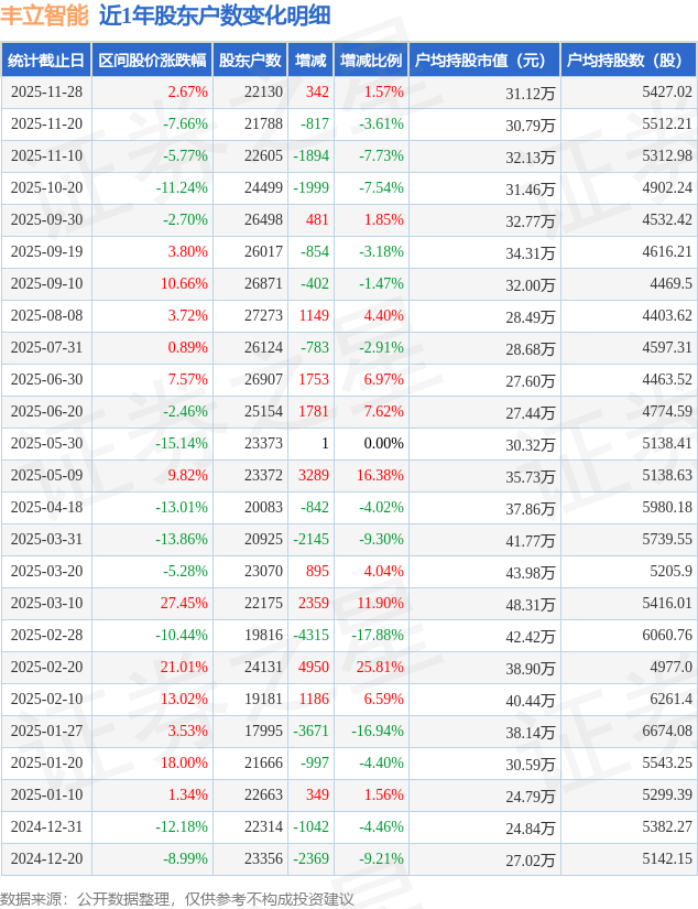 从股价来看,2025年11月20日至2025年11月28日,丰立智能区间涨幅为2.67%,在此期间股东户数增加342.0户,增幅为1.57%。