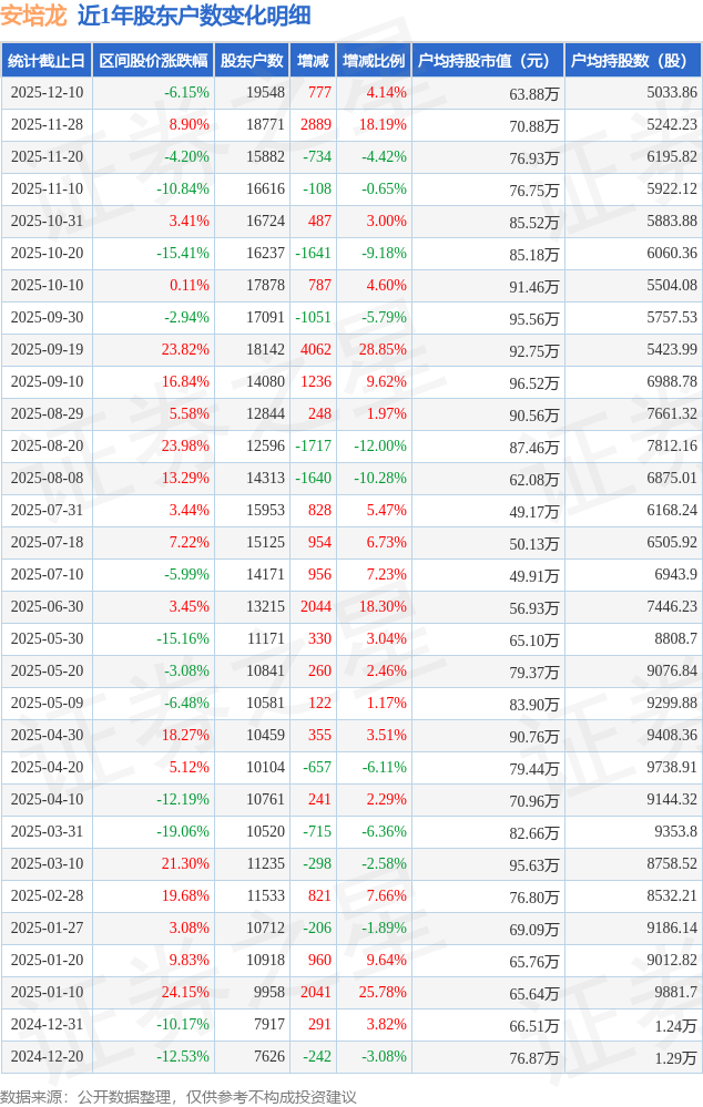 从股价来看,2025年11月28日至2025年12月10日,安培龙区间跌幅为6.15%,在此期间股东户数增加777.0户,增幅为4.14%。