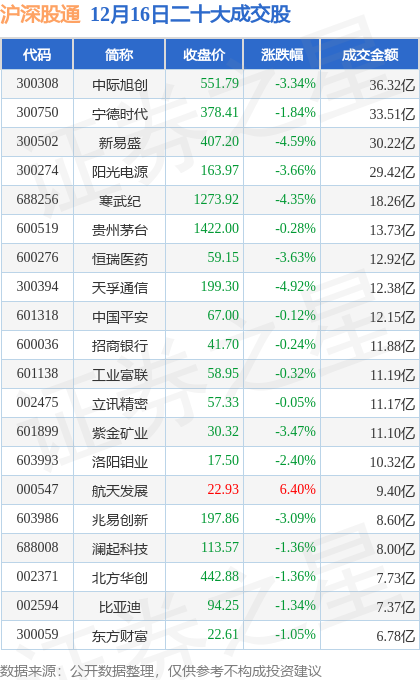当日北向资金余额额度充足,浙江世宝(002703)领涨,涨幅10.04%,交易所公布的沪深股通二十大成交股中成交额前三的为中际旭创、宁德时代、新易盛,成交额分别为36.32亿元、33.51亿元、30.22亿元。详情可见下表: