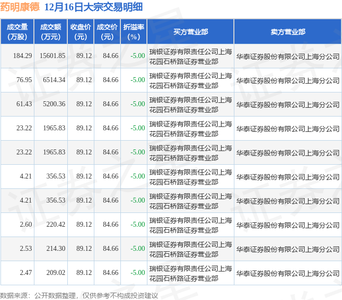 证券之星消息,12月16日药明康德发生大宗交易,交易数据如下: