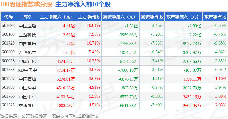 资金流向方面,180治理(000021)指数成份股当日主力资金净流出合计33.63亿元,游资资金净流入合计6.21亿元,散户资金净流入合计27.42亿元。成份股资金流向详情见下表: