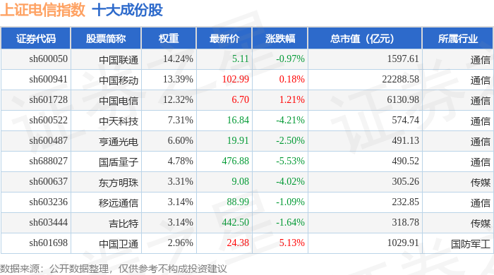 证券之星消息,12月16日,上证电信(000040)指数报收于3766.87点,跌1.64%,成交285.03亿元,换手率0.87%。当日该指数成份股中,上涨的有5家,中国卫通以5.13%的涨幅领涨,下跌的有28家,中国电影以9.47%的跌幅领跌。