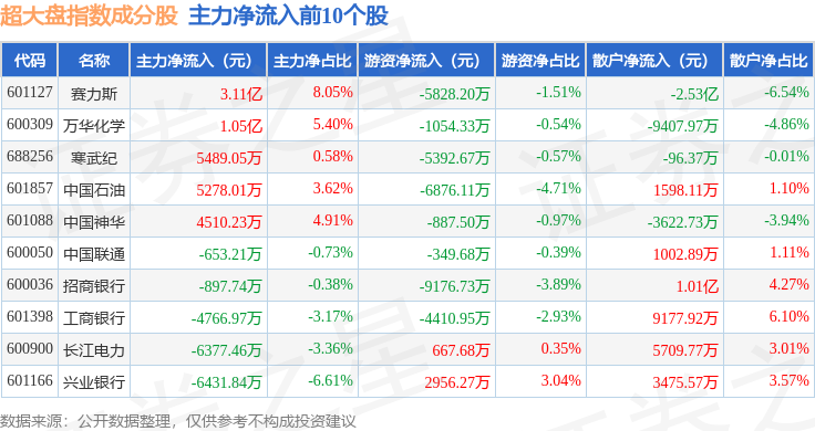 资金流向方面,超大盘(000043)指数成份股当日主力资金净流出合计27.61亿元,游资资金净流入合计3.99亿元,散户资金净流入合计23.63亿元。成份股资金流向详情见下表: