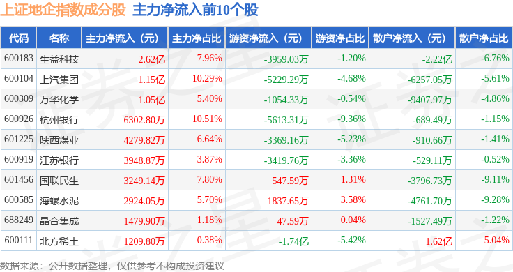 资金流向方面,上证地企(000055)指数成份股当日主力资金净流出合计24.96亿元,游资资金净流入合计6.26亿元,散户资金净流入合计18.7亿元。成份股资金流向详情见下表: