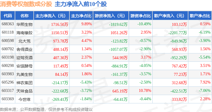 资金流向方面,消费等权(000074)指数成份股当日主力资金净流出合计4.16亿元,游资资金净流入合计2.38亿元,散户资金净流入合计1.78亿元。成份股资金流向详情见下表: