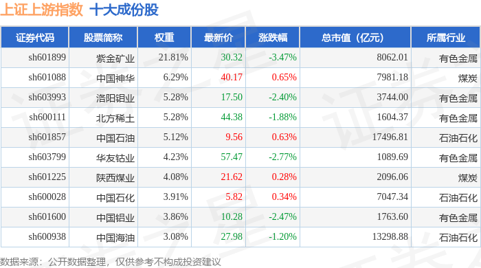 上证上游(000094)指数十大成份股详情如下: