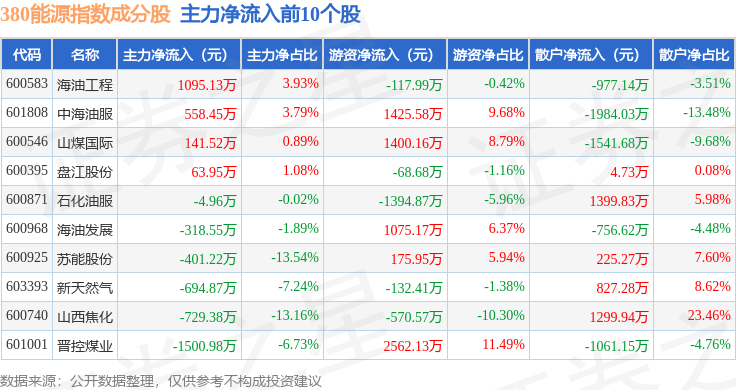 资金流向方面,380能源(000104)指数成份股当日主力资金净流出合计2.22亿元,游资资金净流入合计1.3亿元,散户资金净流入合计9177.92万元。成份股资金流向详情见下表: