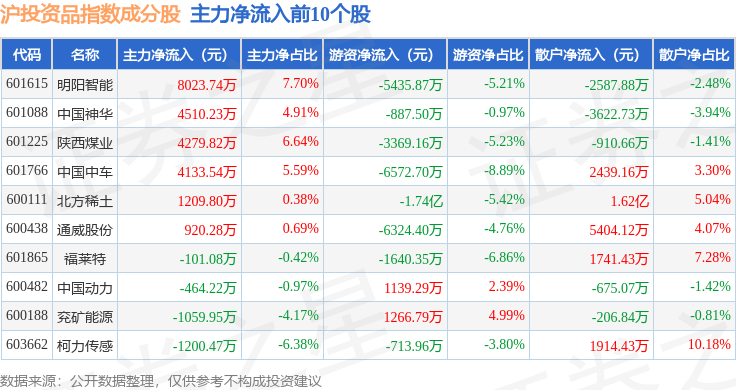 资金流向方面,沪投资品(000102)指数成份股当日主力资金净流出合计54.71亿元,游资资金净流入合计11.17亿元,散户资金净流入合计43.53亿元。成份股资金流向详情见下表: