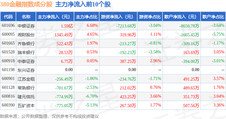 资金流向方面,380金融(000110)指数成份股当日主力资金净流出合计9088.99万元,游资资金净流入合计7719.62万元,散户资金净流入合计1369.38万元。成份股资金流向详情见下表: