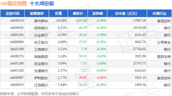 证券之星消息,12月16日,180稳定(000125)指数报收于11720.81点,跌0.7%,成交693.38亿元,换手率0.24%。当日该指数成份股中,上涨的有23家,春秋航空以2.48%的涨幅领涨,下跌的有66家,寒武纪以4.35%的跌幅领跌。