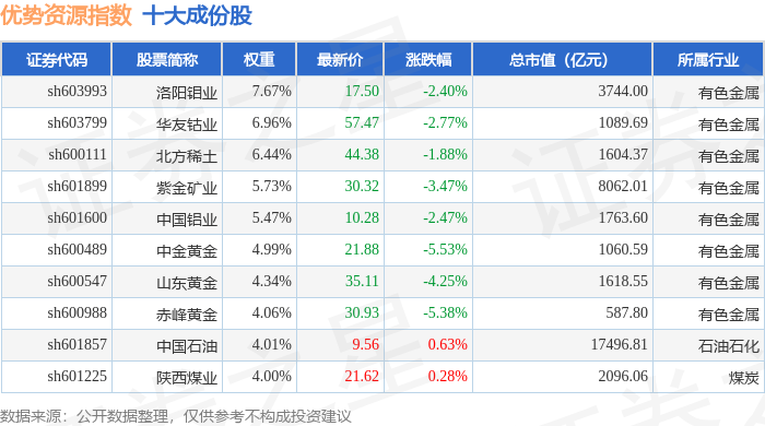 优势资源(000145)指数十大成份股详情如下: