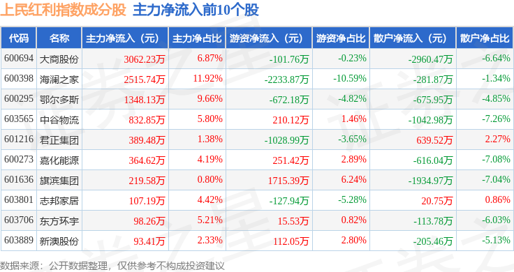资金流向方面,上民红利(000153)指数成份股当日主力资金净流出合计1.8亿元,游资资金净流入合计1.16亿元,散户资金净流入合计6398.22万元。成份股资金流向详情见下表: