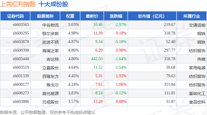 上民红利(000153)指数十大成份股详情如下: