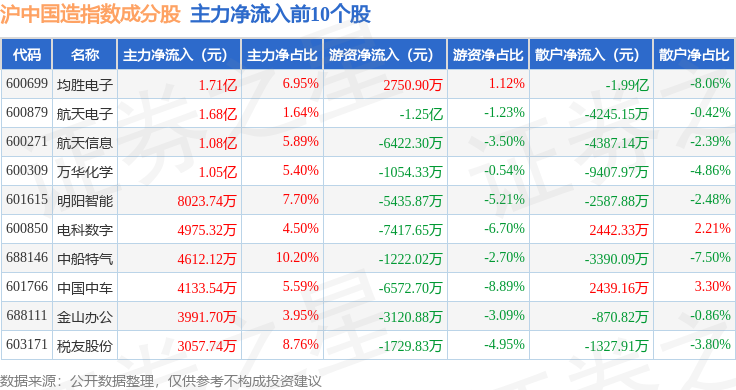 资金流向方面,沪中国造(000161)指数成份股当日主力资金净流出合计61.69亿元,游资资金净流入合计11.41亿元,散户资金净流入合计50.28亿元。成份股资金流向详情见下表: