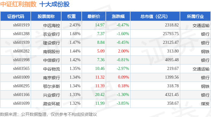中证红利(000922)指数十大成份股详情如下: