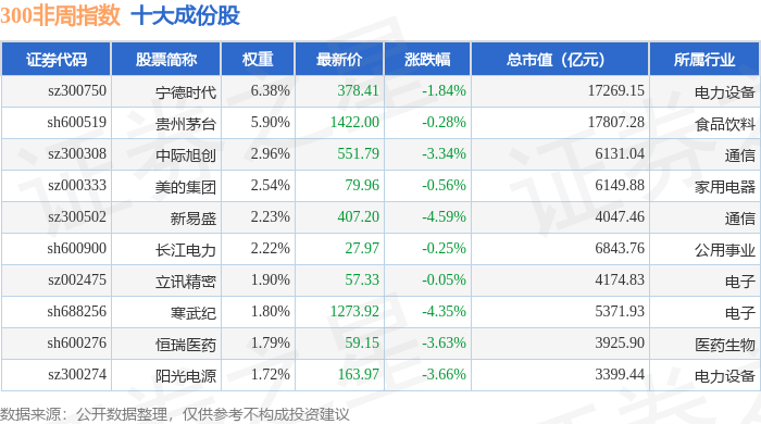 300非周(000969)指数十大成份股详情如下: