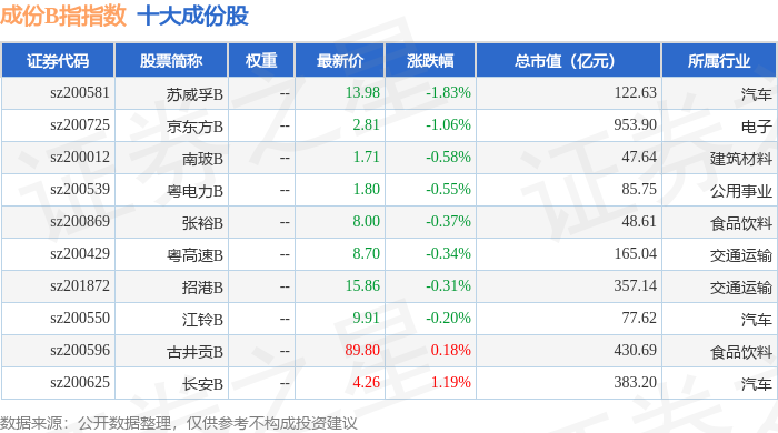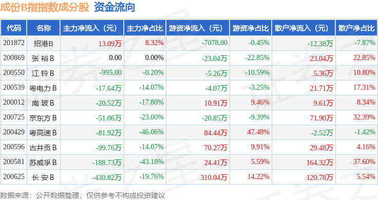 资金流向方面,成份B指(399003)指数成份股当日主力资金净流出合计877.46万元,游资资金净流入合计446.16万元,散户资金净流入合计431.3万元。成份股资金流向详情见下表: