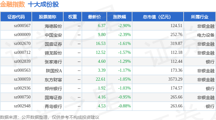 金融指数(399240)十大成份股详情如下: