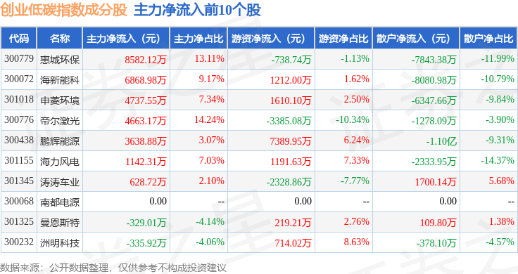 资金流向方面,创业低碳(399259)指数成份股当日主力资金净流出合计44.51亿元,游资资金净流入合计3.99亿元,散户资金净流入合计40.52亿元。成份股资金流向详情见下表: