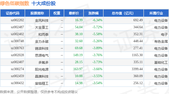 绿色低碳(399258)指数十大成份股详情如下: