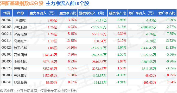 资金流向方面,深新基建(399274)指数成份股当日主力资金净流出合计72.17亿元,游资资金净流入合计37.71亿元,散户资金净流入合计34.46亿元。成份股资金流向详情见下表: